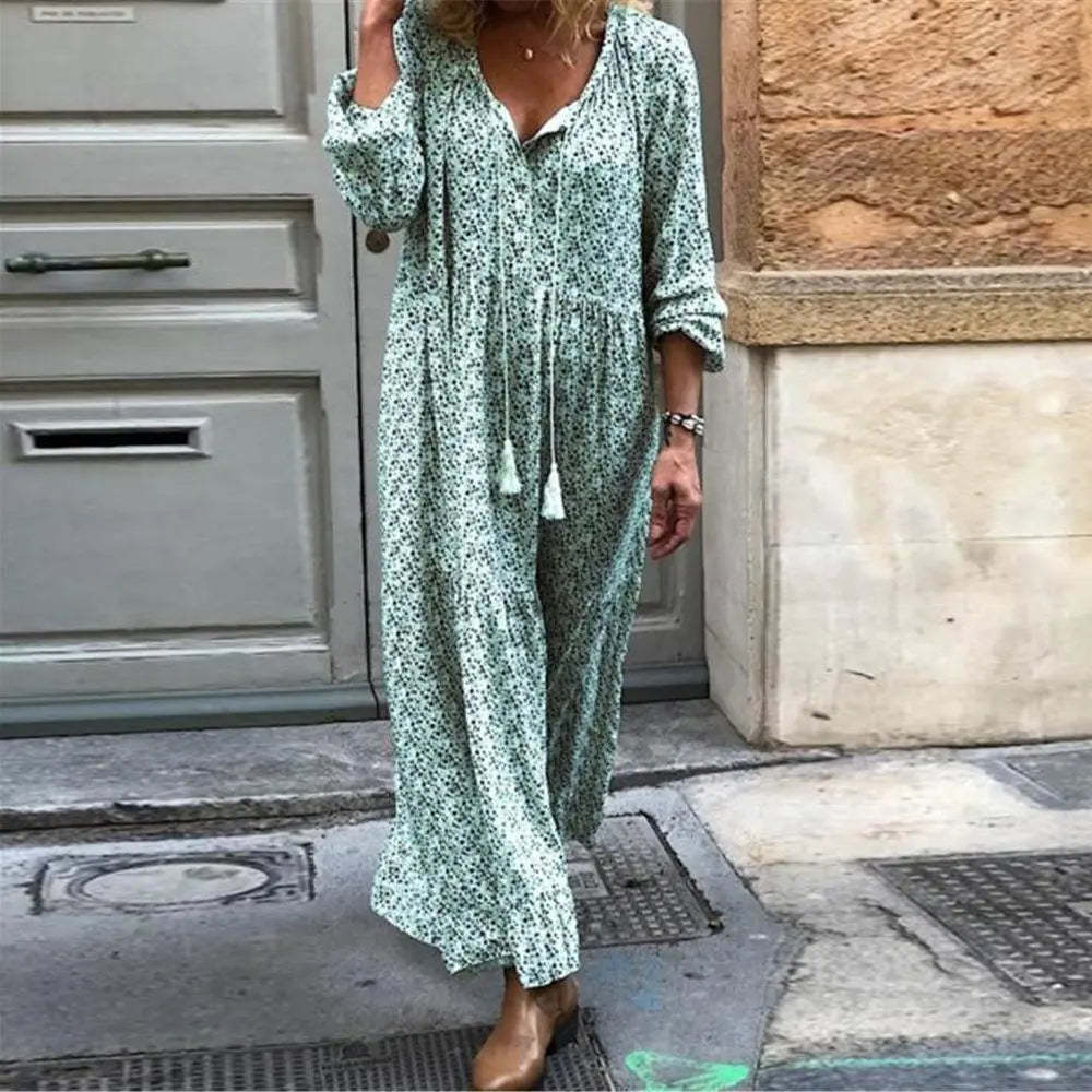 Women's Boho Floral Print V Neck Loose Maxi Ruffle Peplum Dress